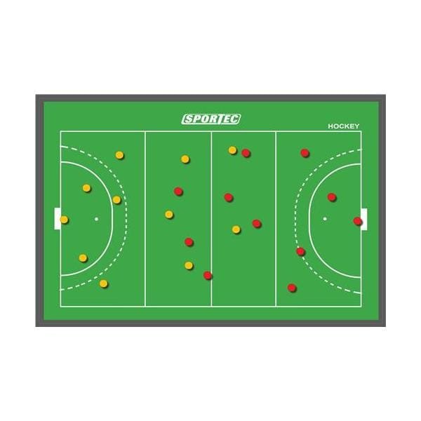 Dit coachbord hockey van het merk Sportec is magnetisch. De afmeting is 90×60 cm en de magneten en whiteboard marker worden bijgeleverd.